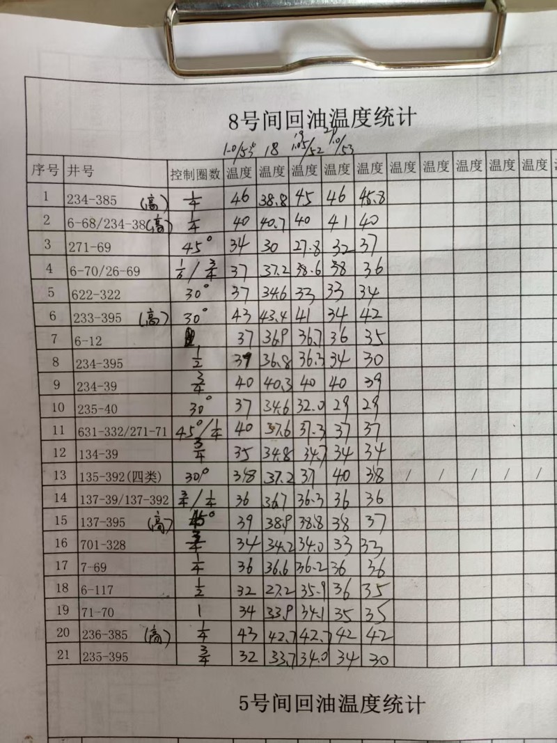 为控制好掺水,常青井组设计了计量间回油温度统计表,每天早上对回油温度进行统计,然后合理控制掺水,下午对回油温度变化情况进行对照,保障生产的顺利进行。 零下的天气,中十三采油班的干部员工,用饱满的热情,保持着掺水正常。为作业区高质量发展保驾护航。(秦雪) |